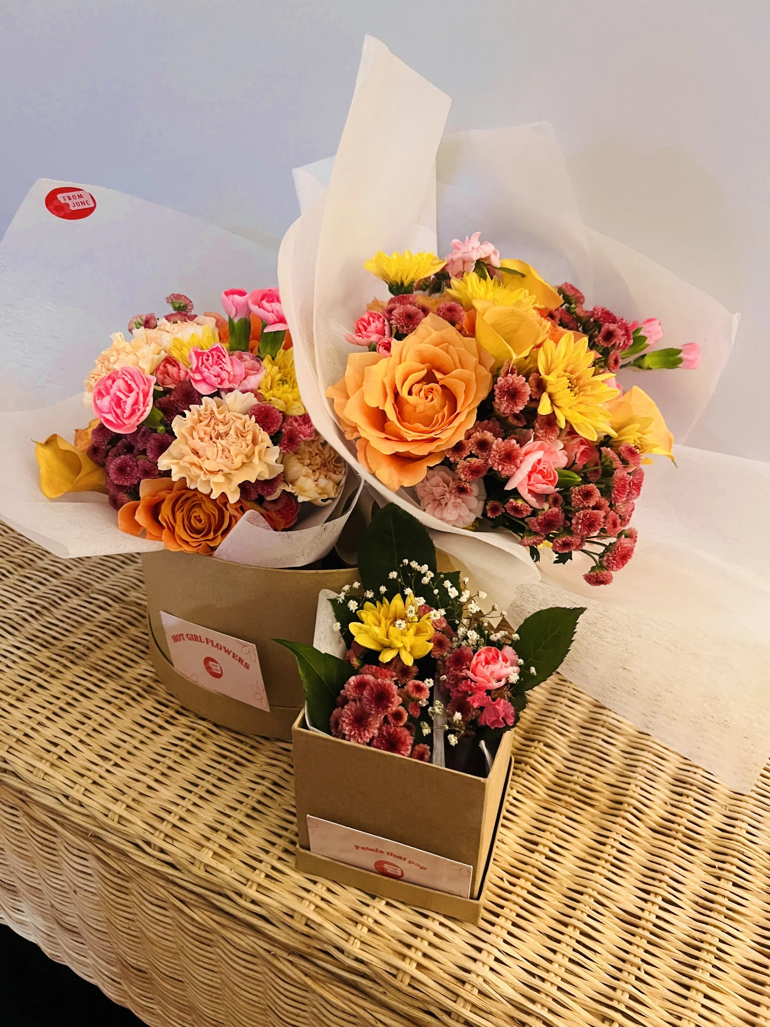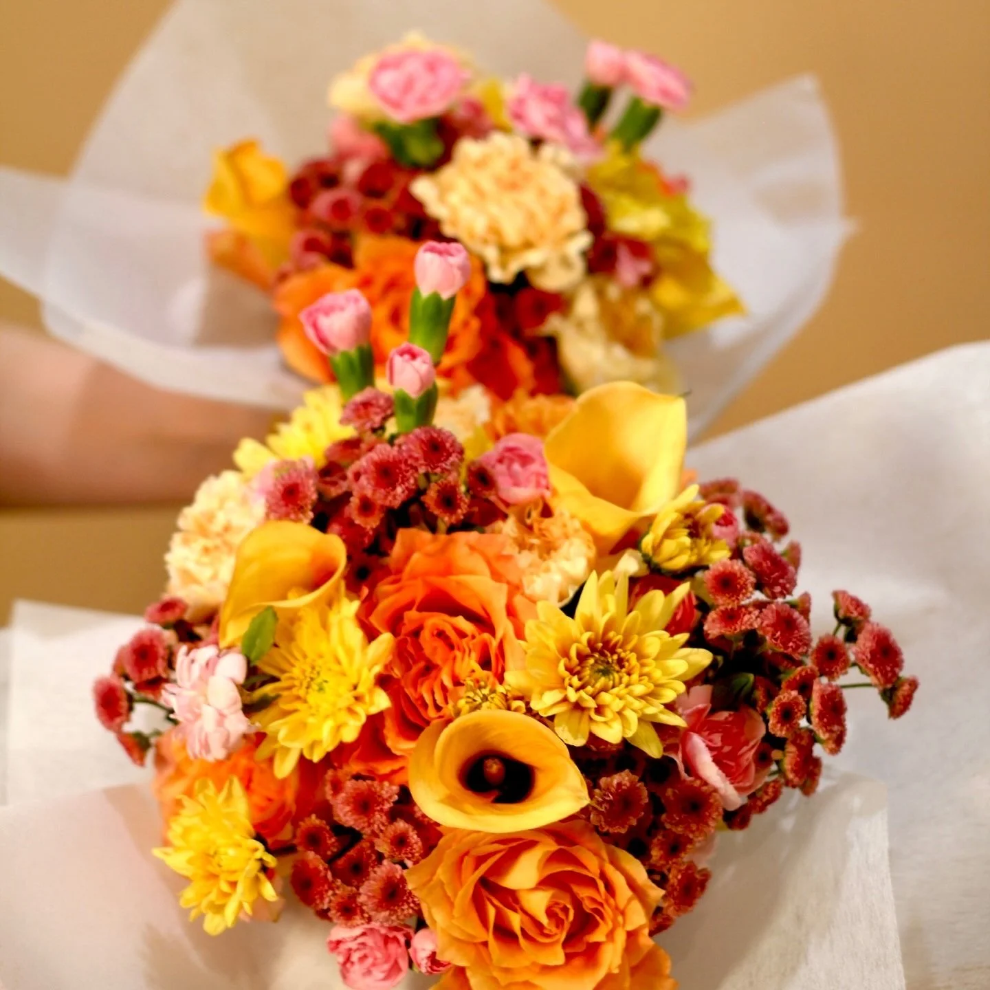 Two bouquets of colorful fresh flowers wrapped in white paper, featuring orange roses, yellow chrysanthemums, pink carnations, and calla lilies.