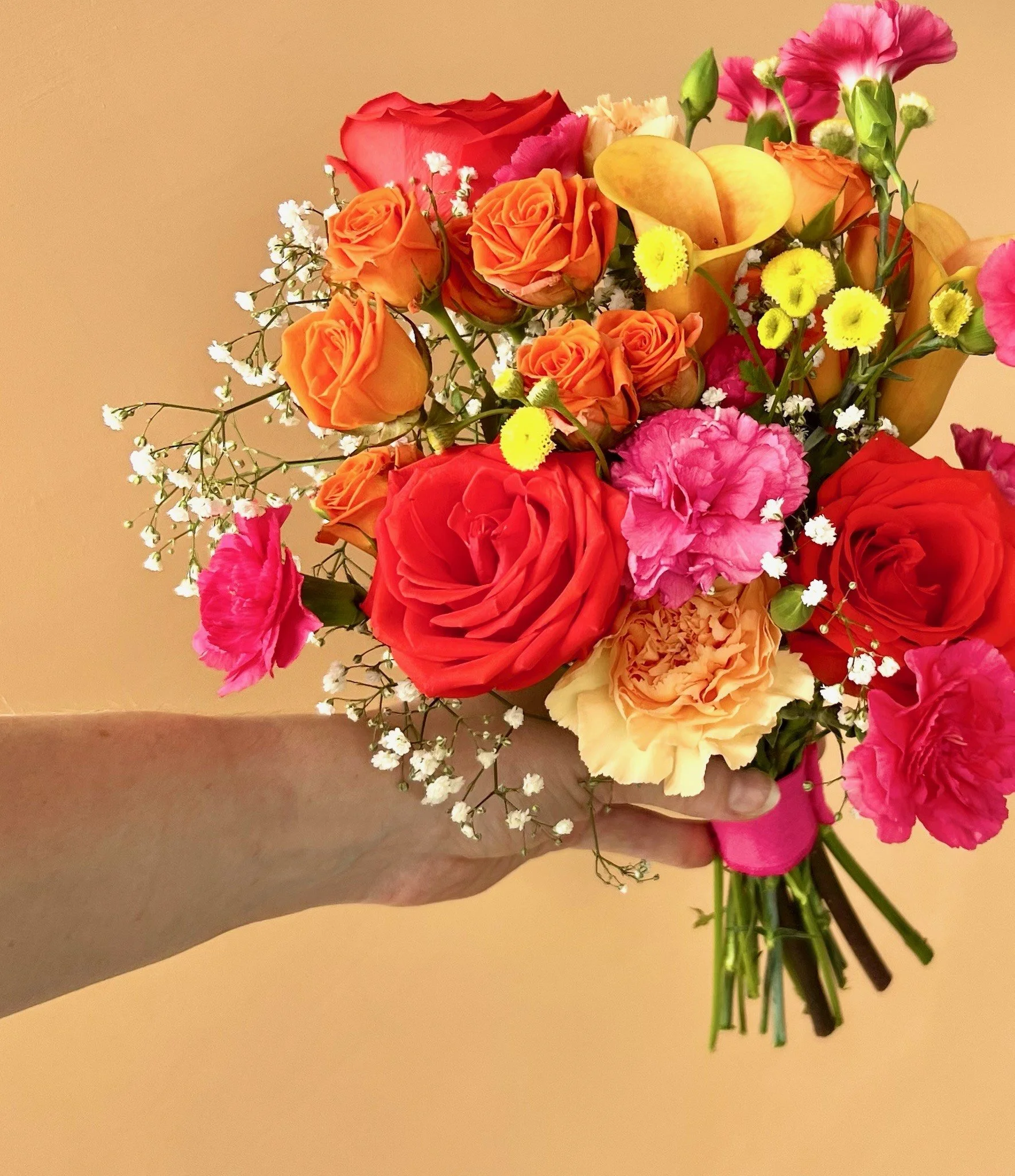 A hand holding a colorful bouquet of mixed flowers including roses, carnations, calla lilies, baby's breath, and other blooms against a peach background.