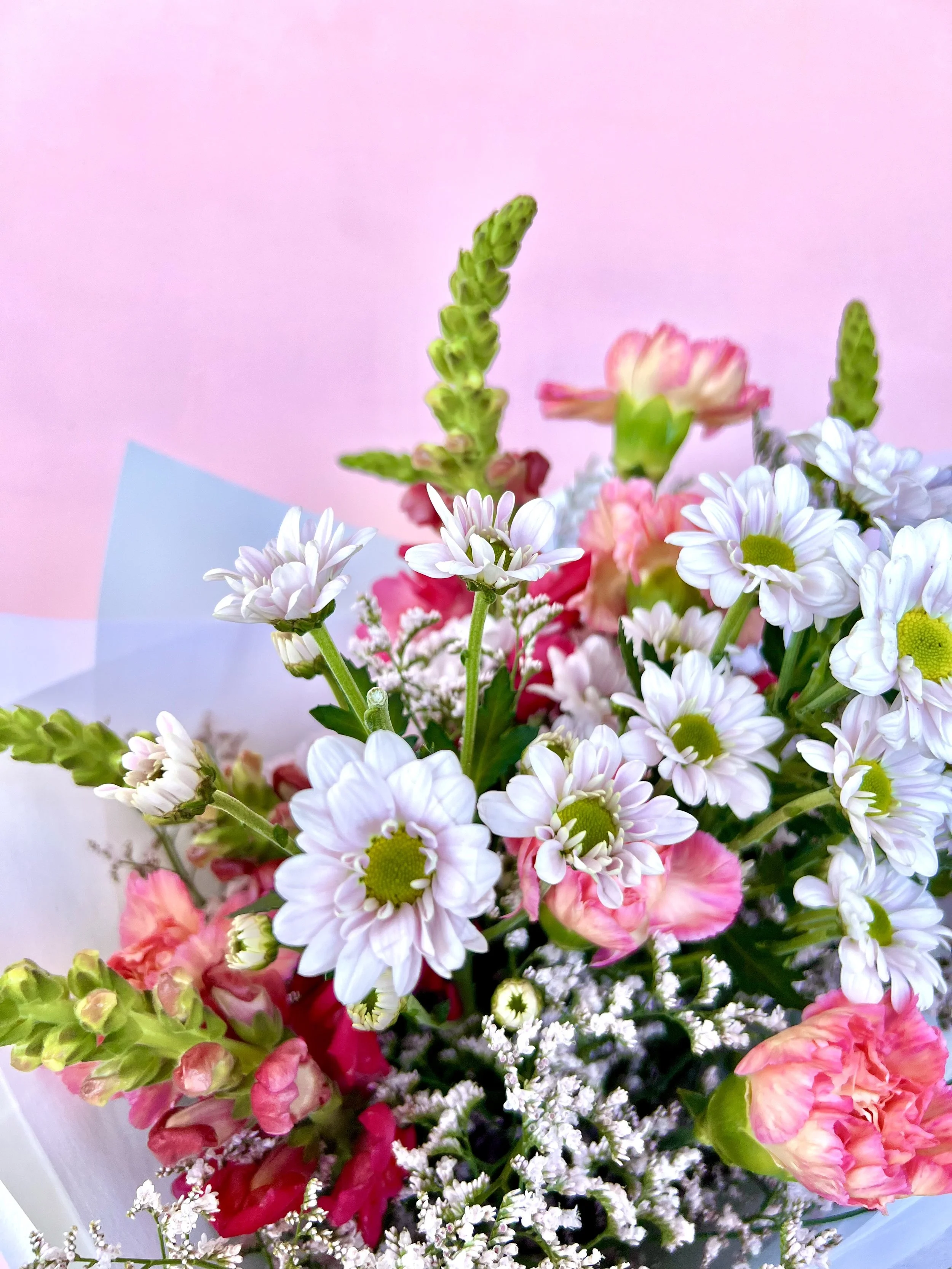 Bright, colorful bouquet of various flowers including daisies, carnations, and other blooms against a pink background.