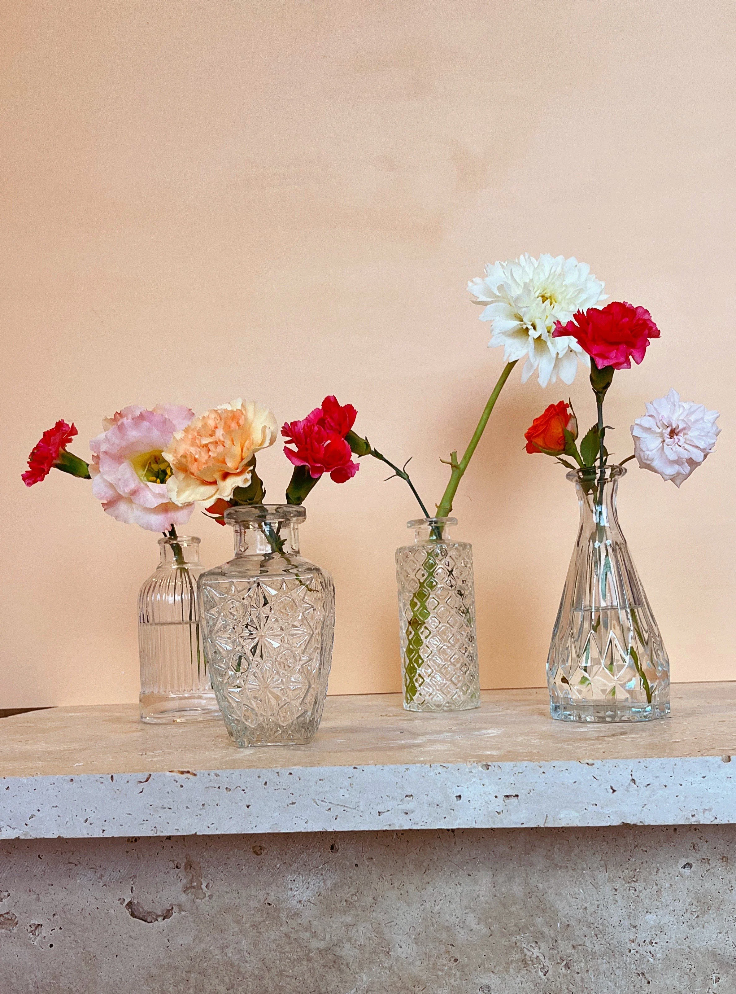 Four glass vases with colorful flowers on a marble shelf against a beige wall.