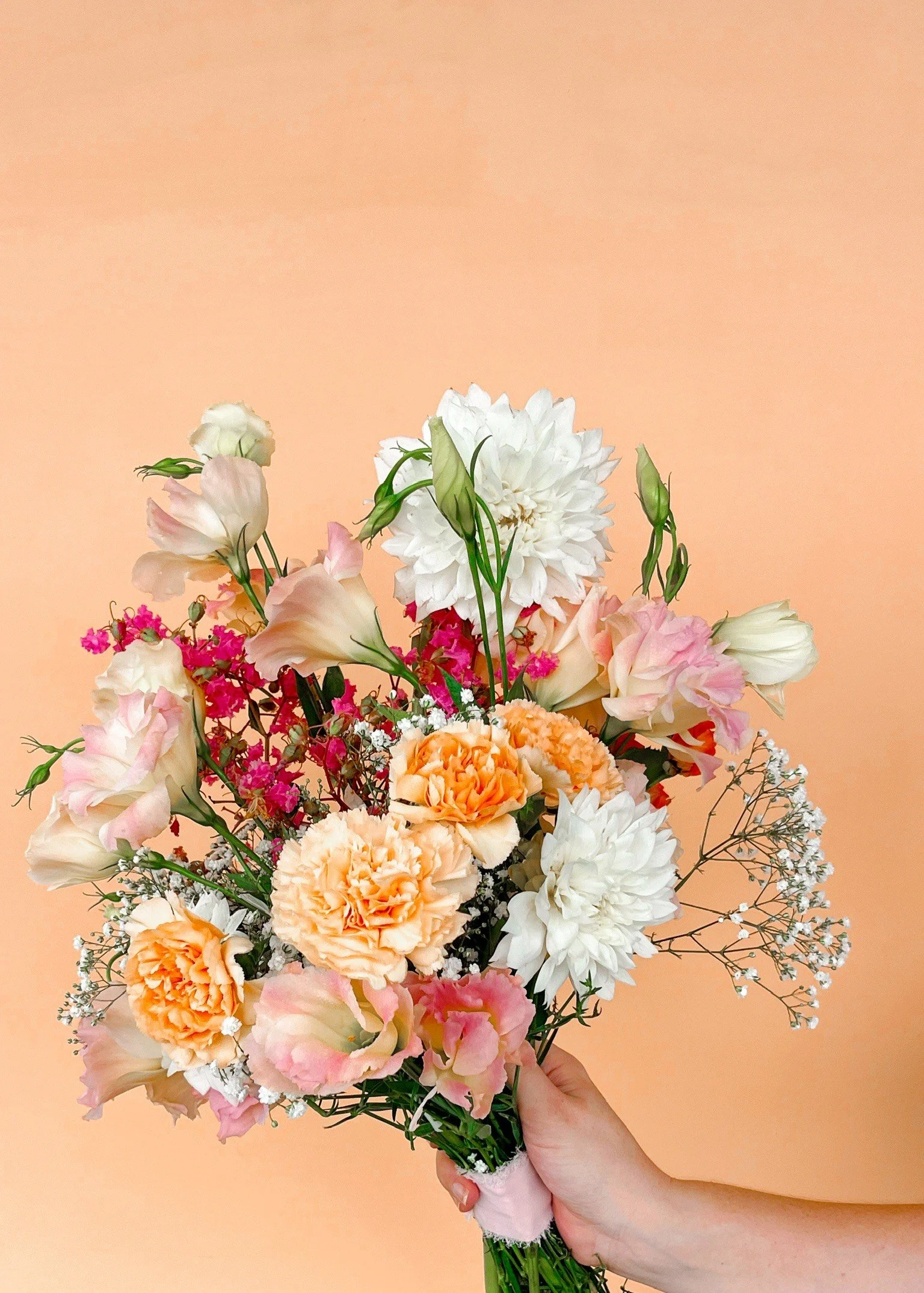 A hand holding a bouquet of mixed flowers including white, peach, and pink blossoms against a peach-colored background.