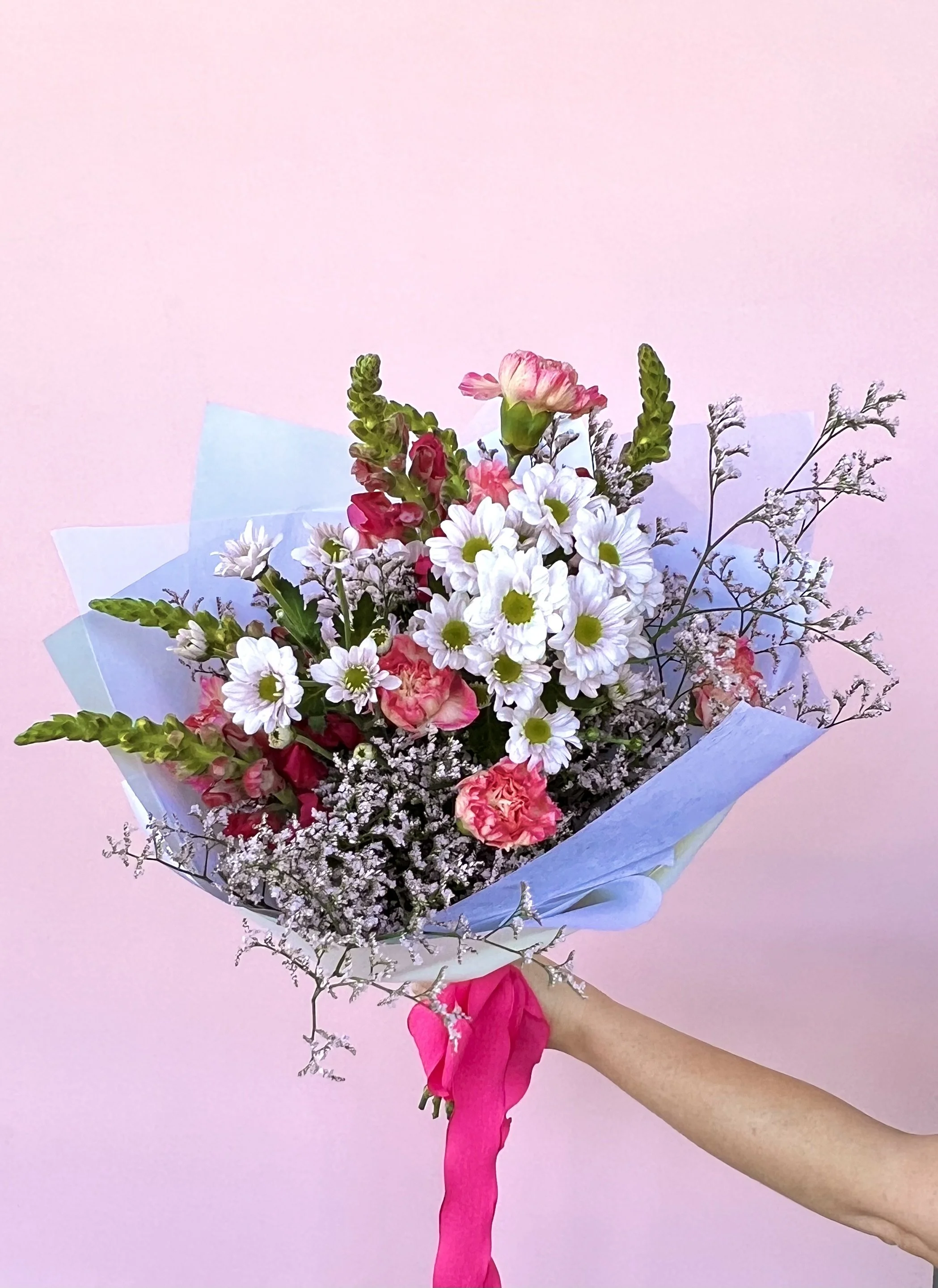 Hand holding a colorful bouquet of pink and white flowers against a pink background.